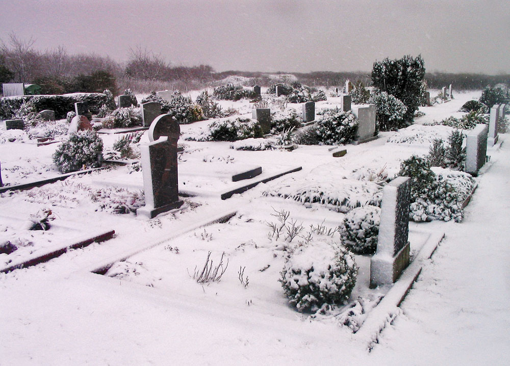 Nur wenig Windschutz bieten die niedrigen Büsche und Bäume, die um den Friedhof umzu wachsen. Auf dieser Aufnahme sehen wir einige Gräberreihen; die Grabsteine sind an ihrer Luv-Seite mit Schnee bedeckt.