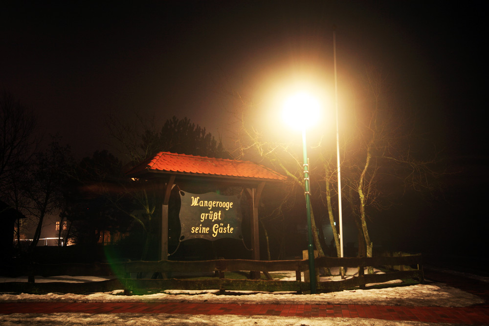 Gäste, die am Bahnhof ankommen und in Richtung Norden laufen, werden von diesem Schild mit der Aufschrift »Wangerooge grüßt seine Gäste« empfangen.