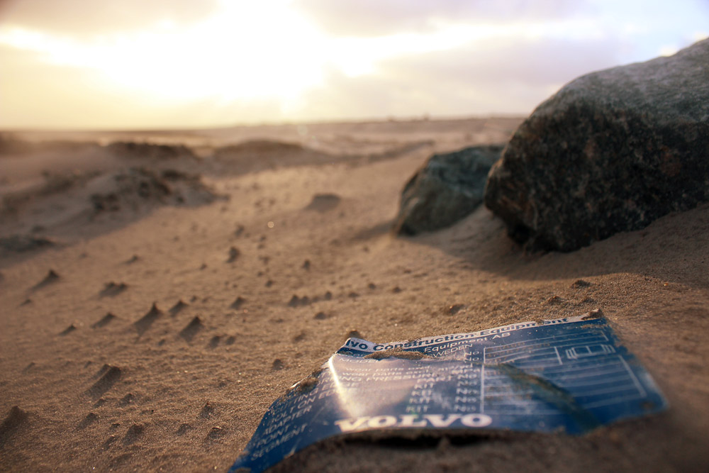 Ein herrenloses Typenschild eines Volvo-Baufahrzeugs ist hier nahe des Westanlegers zwischen Sand und Steinen aufgetaucht. Vermutlich stammt es von der Sandaufspülung, die im Jahre 2014 an den »Harle Hörn«-Dünen durchgeführt wurde.