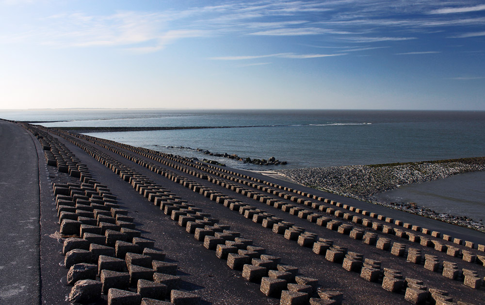Wir lassen uns nun am Westdeckwerk für einige Minuten nieder und genießen den herrlichen Ausblick auf die Nordsee und das »Harle«-Seegatt.