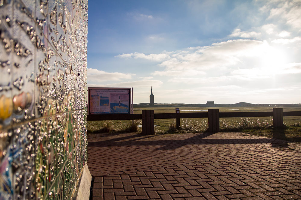 Vom Fuß des Neuen Leuchtturms wird hier in Richtung Westturm geblickt. Geradeaus befindet sich eine Schautafel, die die Funktion des »Leuchtturms Wangerooge« erklärt.