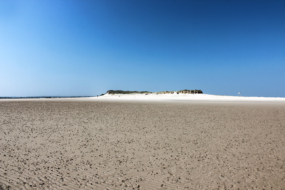 Am Übergang vom Strand (rechts) zum Wattenmeer entstand dieses Foto. Genau geradeaus befinden sich die Ostdünen, die aus einiger Entfernung sehr niedrig wirken.