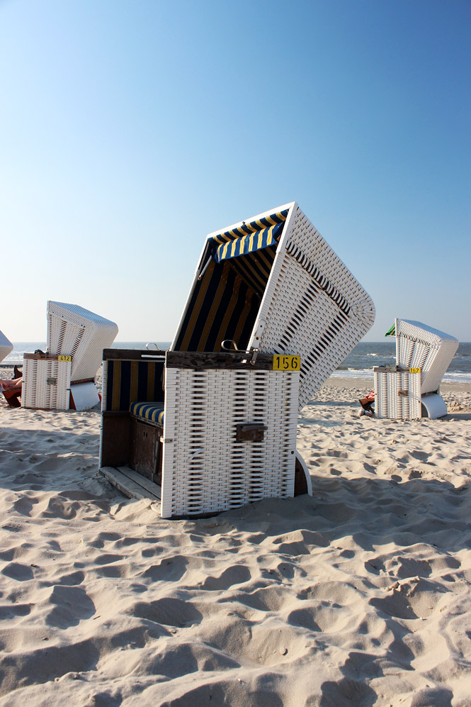‹ Abends laden die verwaisten Körbe des Hauptstrandes zum Verweilen ein. Solang man nichts durcheinander bringt oder gar zerstört, hat in der Regel auch niemand etwas dagegen.