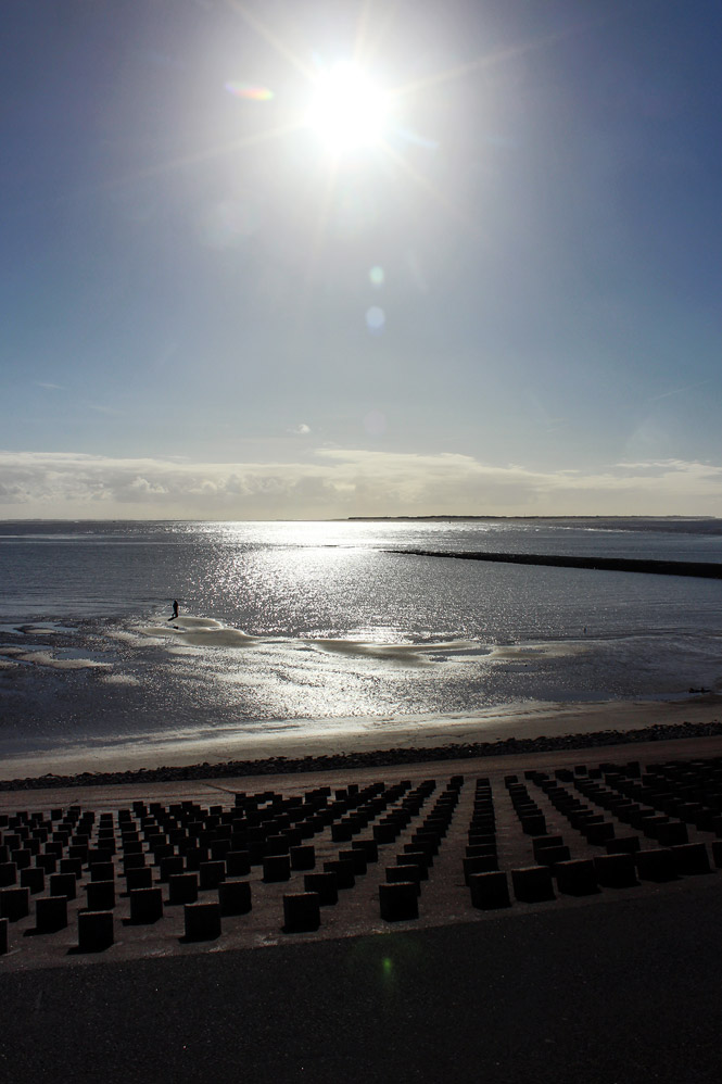 ‹ Vom Deckwerk aus blicken wir hinab auf den Weststrand, die Buhne »U« und das Seegatt »Dove Harle«. Am Horizont erkennt man die Ostdünen der Insel Spiekeroog.