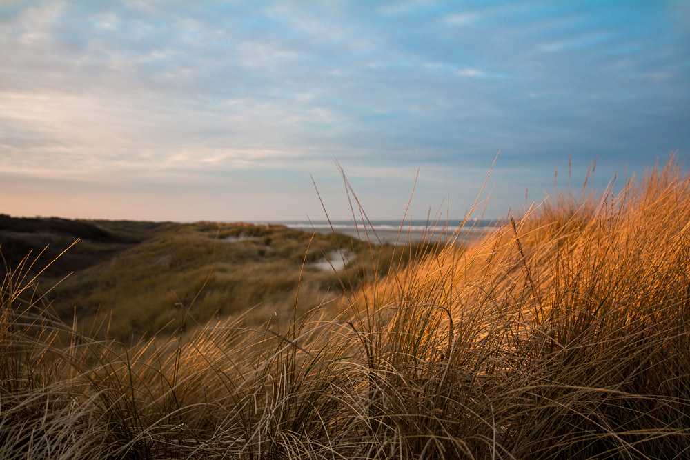 Zwischen den Vor- und den Hauptdünen ist im Osten sogar noch ein langgezogenes Dünental vorhanden. Während das Dünengras hier oben an der Überwegung noch von der Sonne bestrahlt wird, liegt das Dünental bereits im Schatten.