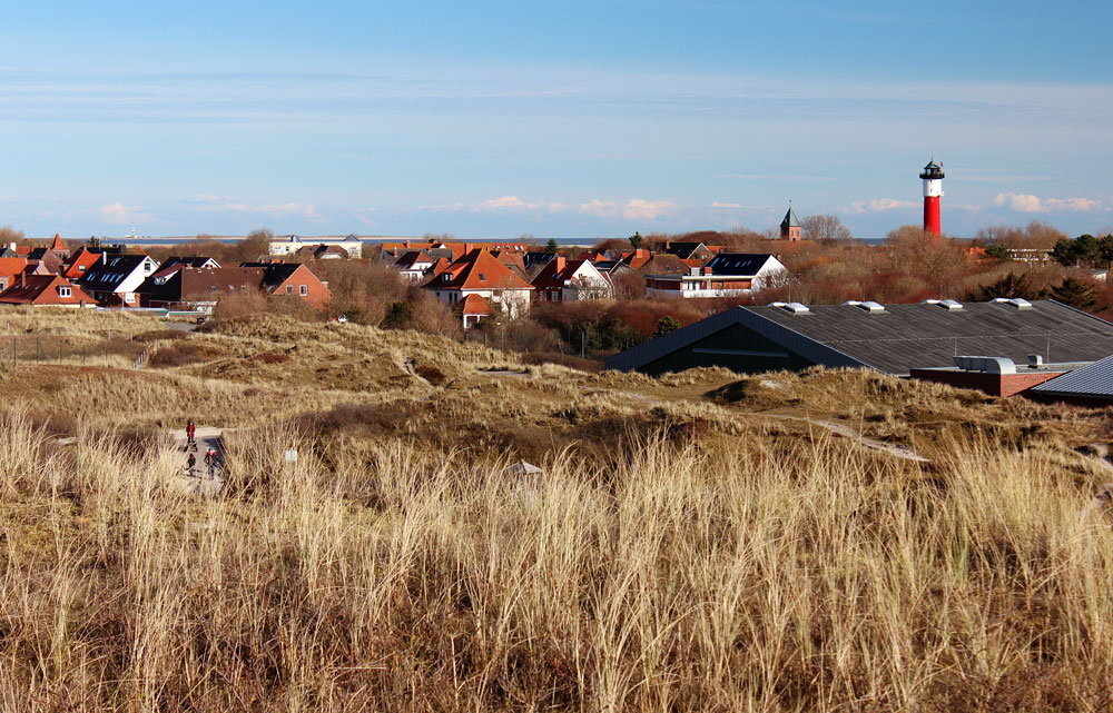 Hier ein weiterer Blick von der Aussichtsdüne in Richtung Inseldorf. Rechts sehen Sie die Tennishalle, dahinter den Alten Leuchtturm und die evangelische Nikolaikirche. Der Abenteuerspielplatz ist nicht zu erkennen, er befindet sich zwischen der Tennishalle und dem Fotostandort.
