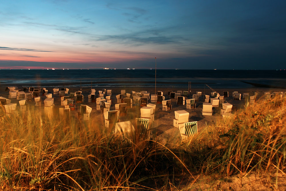 Es ist bereits recht dunkel geworden, in Richtung Nordwesten ist allerdings noch deutlich die Abenddämmerung erkennbar. Wir blicken hier auf die Strandkörbe des Westfeldes, auch die Beachvolleyball-Netze sind hinter den Strandkorbreihen auszumachen.