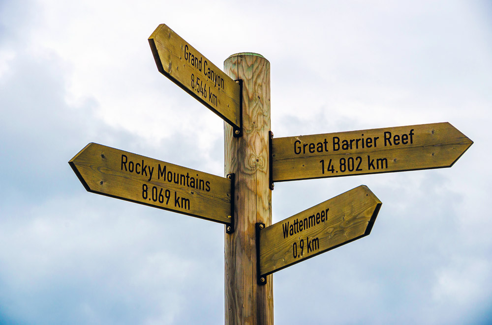 An der westlichen Promenade befindet sich ein Wegweiser, der auf verschiedenste UNESCO-Weltnaturerbestätten verweist, in diesem Fall auf den Grand Canyon (8.546 Kilometer entfernt), das Great Barrier Reef (14.802 Kilometer entfernt), die Rocky Mountains (8.069 Kilometer entfernt) sowie das Wattenmeer (0,9 Kilometer entfernt).