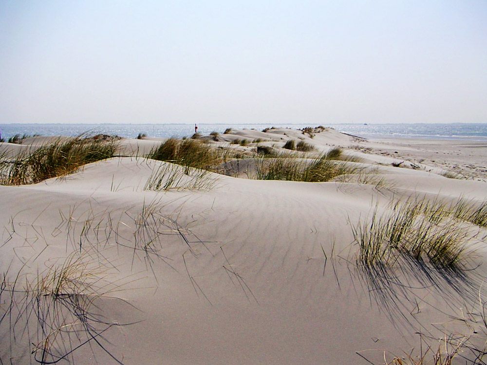 In der Nähe des Westanlegers haben sich einige flache Dünen gebildet, die hier bereits von Strandhafer bewachsen werden. Im Hintergrund sehen Sie das Wattenmeer und am Festland das Ost-Friesische Festland.