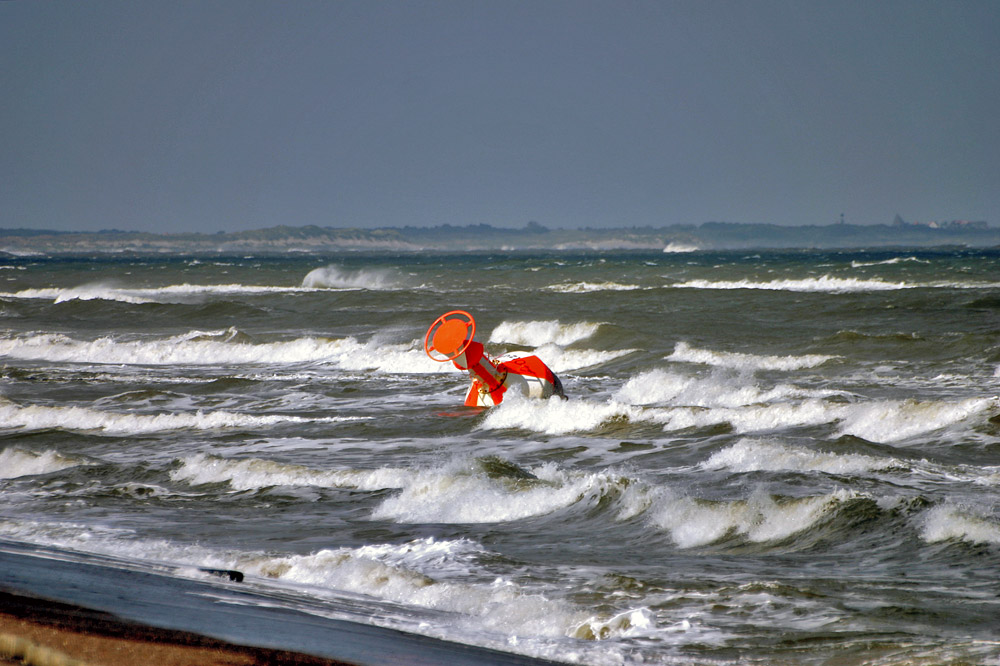 Schaumkronen auf dem Wasser und kräftige Brandung deuten auf einen steif blasenden Wind hin. In der Bildmitte sehen Sie noch einmal die Ansteuerungstonne »Otzumer Balje«, dahinter das Seegatt »Harle« und am Horizont die Nachbarinsel Spiekeroog mit Dorf und katholischer Kirche »St. Peter« (das dreieckige Gebäude ganz rechts), und »Kaapdünen-Bake« (links davon).