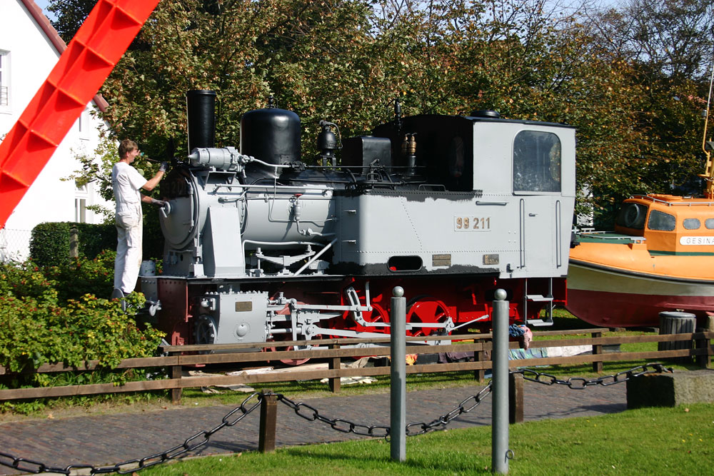 Bevor die Museums-Dampflok »99 211« neu gestrichen wurde, erhielt sie einen weißgrauen Grundierungs-Anstrich, mit dem sie ein wenig gewöhnungsbedürftig aussieht.