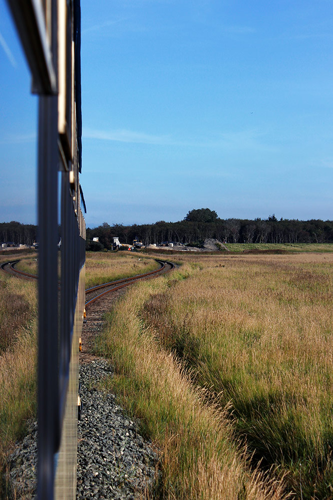 ‹ Die Inselbahn befindet sich nun fast am Dorfgrodendeich. Wir blicken schon einmal voraus und sehen in einiger Entfernung die Baustelle am Deichschart, das momentan deutlich erhöht und verstärkt wird.