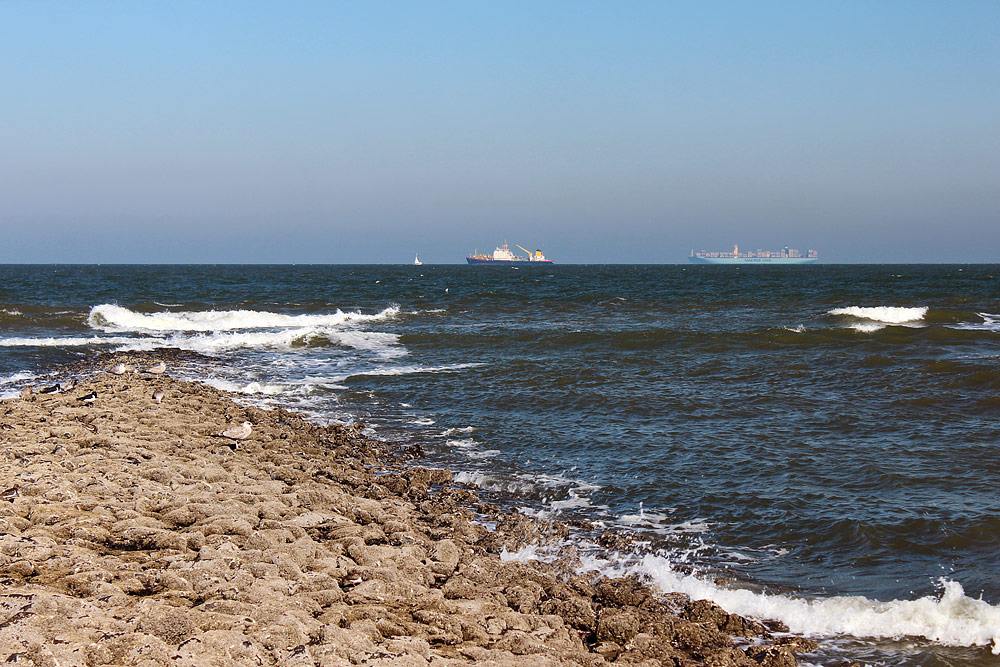 Wir befinden uns nun an der Buhne »N« und blicken aufs Meer. In der Ferne ziehen der Saugbagger »Nordsee« und ein Containerfrachter vorbei.