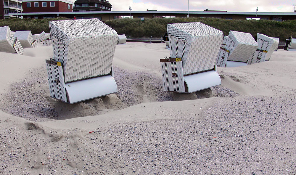 In diese beiden Strandkörbe sollte man sich wohl besser nicht setzen, ohne neuen Sand darunter zu schaufeln. Der kräftig blasende Wind hat große Teile des Sandes fort geweht, so daß die Körbe nun äußerst wackelig stehen!