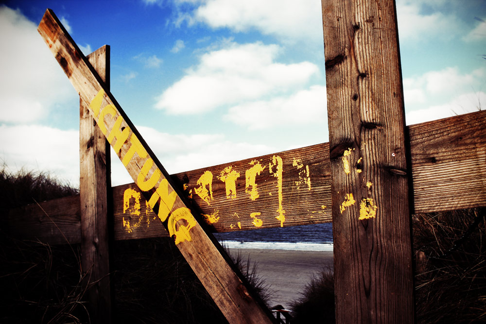 Als die Treppe an der Dünenüberwegung »Bielefelder Heim« erneuert wurde, verhinderte dieses künstlerisch-kreative Baustellenschild den Zugang.
