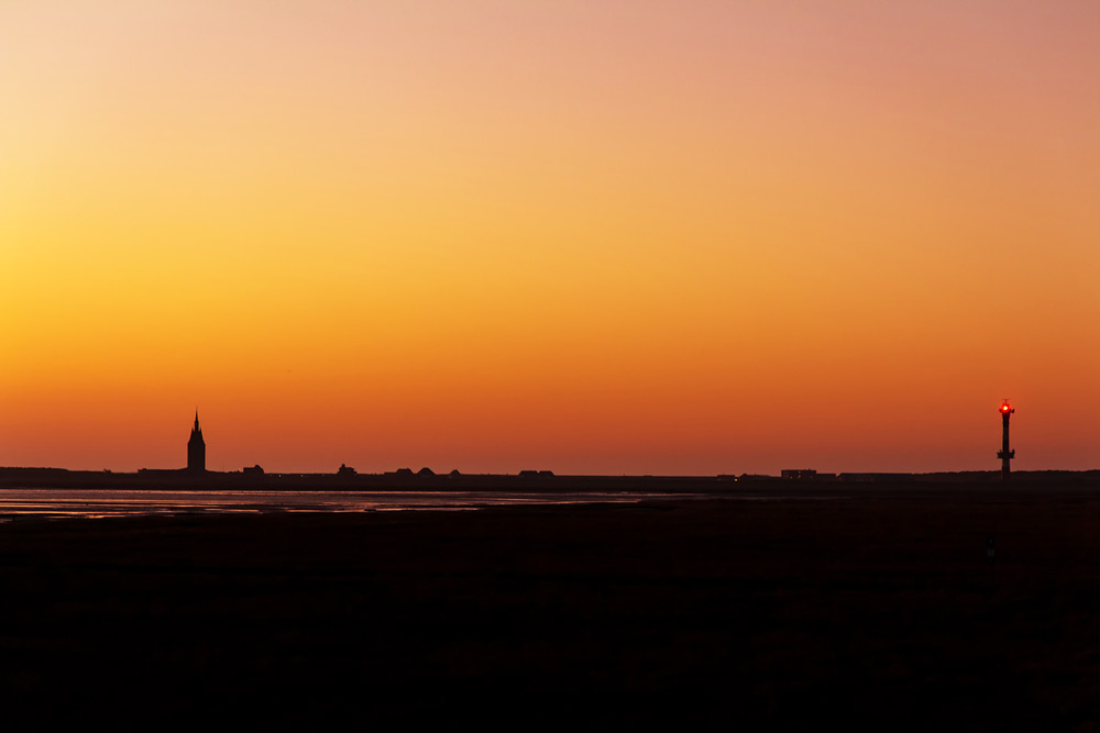 Das Westdorf mit den beiden Türmen von Osten her betrachtet. Die Dämmerung ist mittlerweile über die Insel hereingebrochen, das Feuer des Neuen Leuchtturms leuchtet bereits.