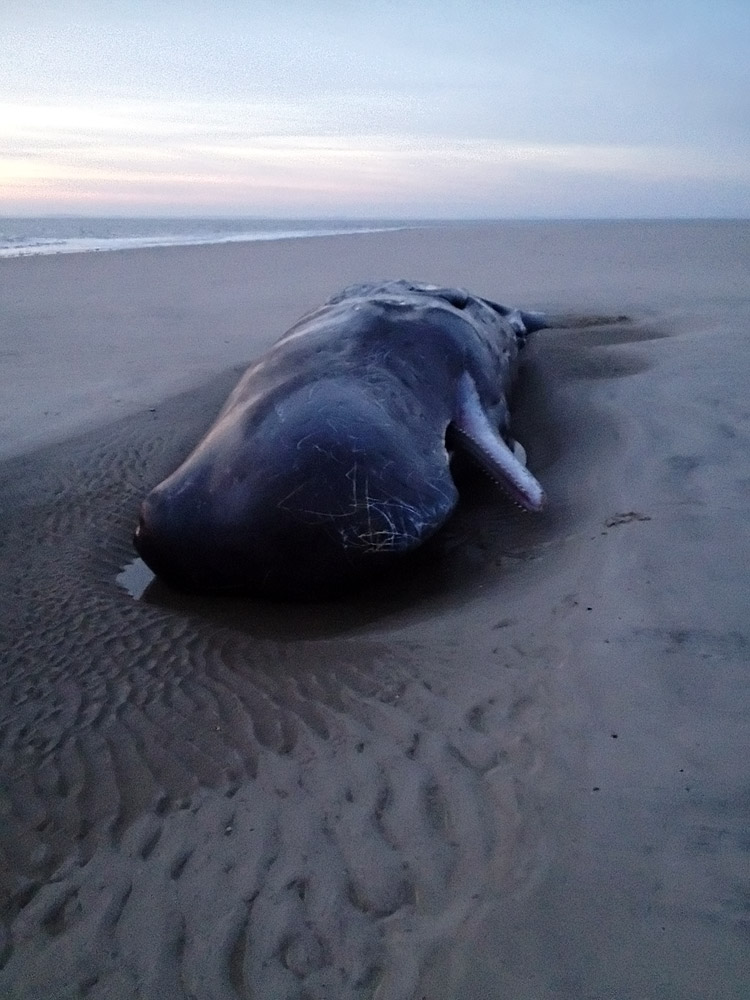 ‹ Auf diesem Foto sehen wir einen der beiden Pottwale, die Anfang Januar 2016 am Wangerooger Ostende angetriebenen wurden. Gut zu erkennen sind zahlreiche Narben am Kopf des Tiers.