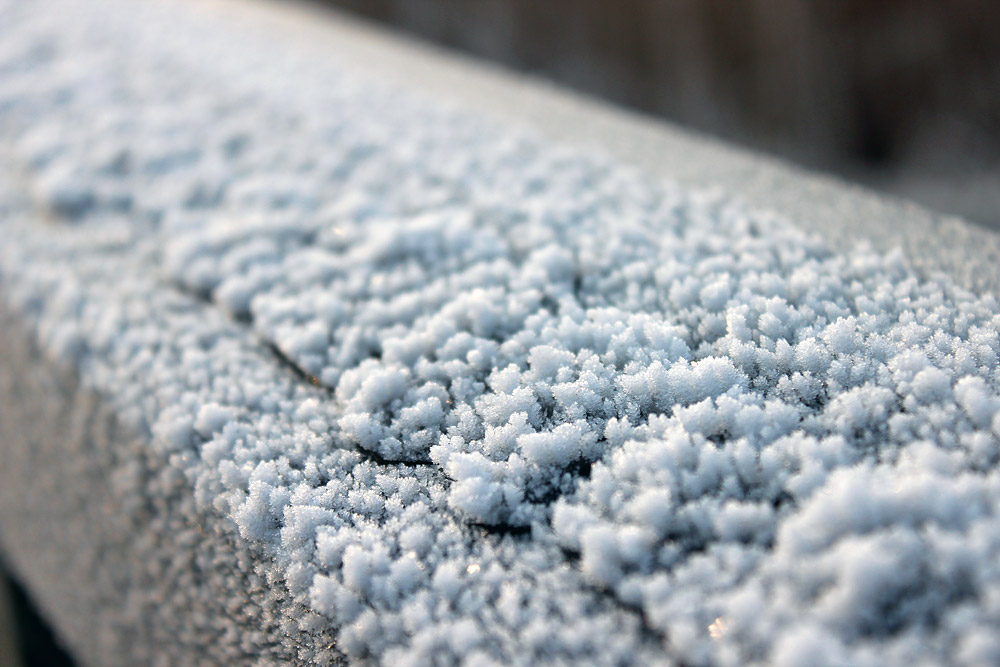 Auf dem Geländer einer kleinen Brücke hat sich, so wie überall auf der Insel, durch Nebel und Frost eine Rauhreifschicht gebildet, die aus winzigen Eiskristallen besteht.