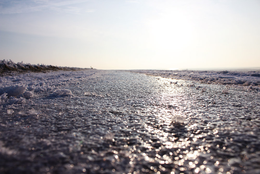 Der Weg auf der Deichkrone ist komplett von einer Eisschicht bedeckt. Es heißt also vorsichtig sein, um nicht hinzufallen!
