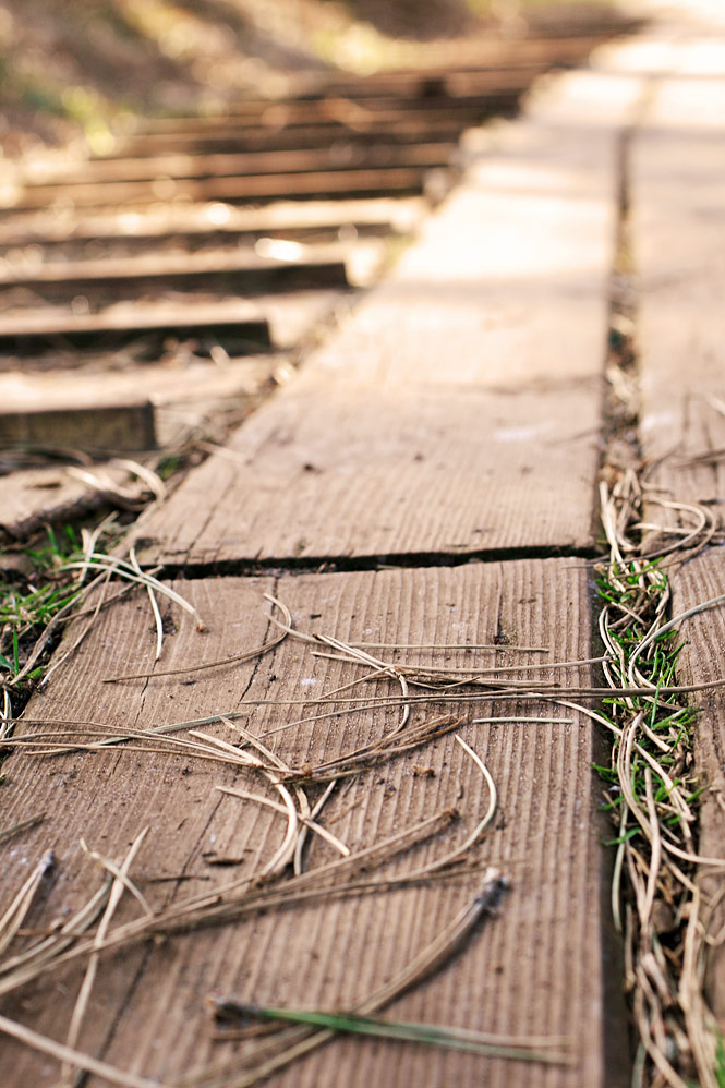 ‹ Alte Kiefernnadeln liegen verstreut auf dem Holzbohlenweg, der ins Schulwäldchen hinein führt, herum.