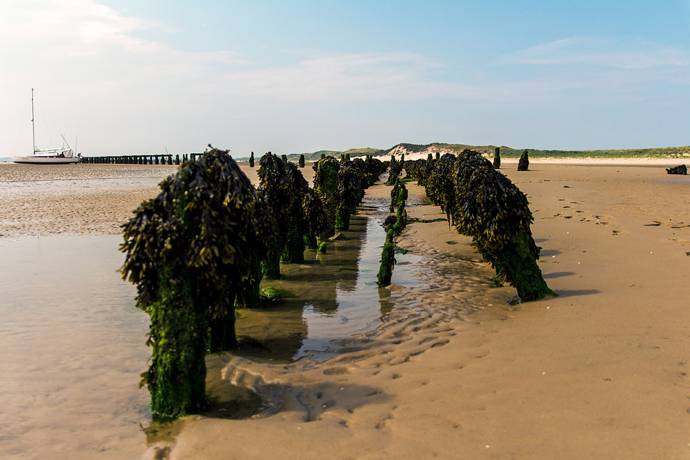 Genau hier befand sich der Wangerooger Ostanleger, die Pfähle sind dick von Blasentang bewachsen.