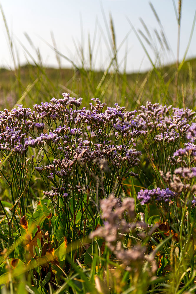 ‹ Der »Gewöhnliche Strandflieder« ist in den Salzwiesen zuhauf zu finden. In diesem Fall wächst er links und rechts der Schotterstraße zum Ostende.