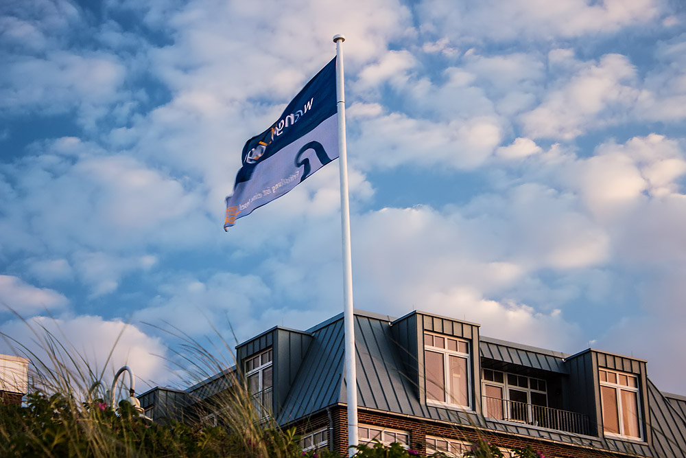An der Strandpromenade wehen zahlreiche Flaggen mit »Wangerooge«-Logo, hier sehen wir eine davon. Unten lugt das Dachgeschoß des Aparthotels »Anna Düne« hinter den Dünen hervor.