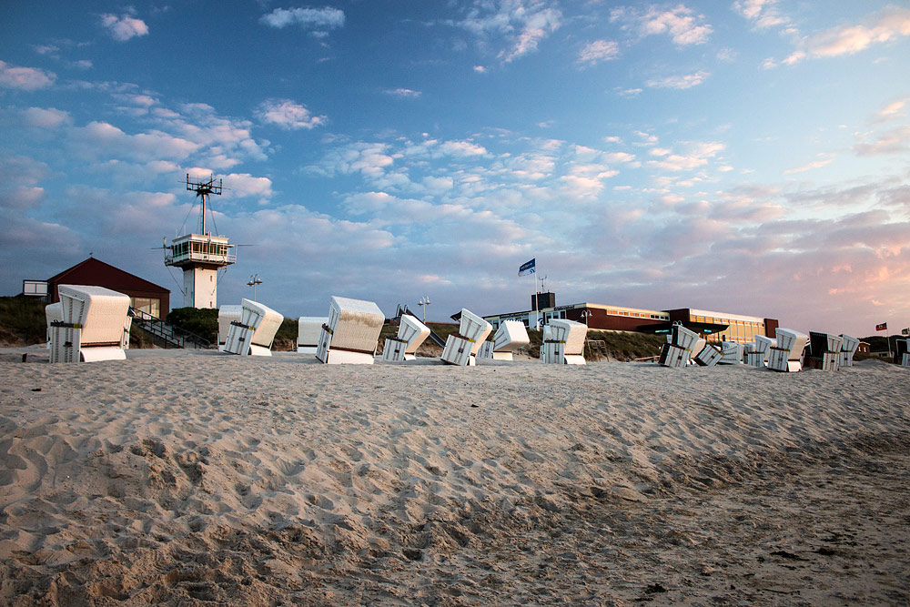 Abendstimmung am Hauptstrand. Im Hintergrund können Sie das Servicegebäude der Kurverwaltung, die Marine-Signalstation und das Kurmittelhaus erkennen.