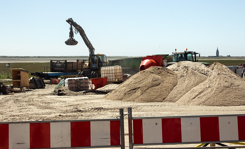 Ein weiterer Blick auf die Baustelle am Deichschart. Hier hat man noch einmal einen Blick auf den Bagger, der den mit Bausand beladenen Flachwagen entlädt. Im Hintergrund der Westturm.