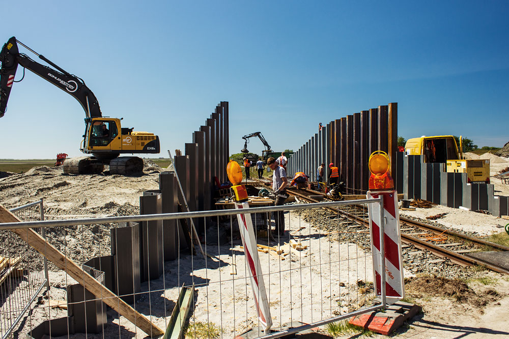 Wir befinden uns nun am Bahnübergang und blicken auf das Deichschart, das zum Aufnahmezeitpunkt im Frühsommer 2016 gerade im Bau ist.