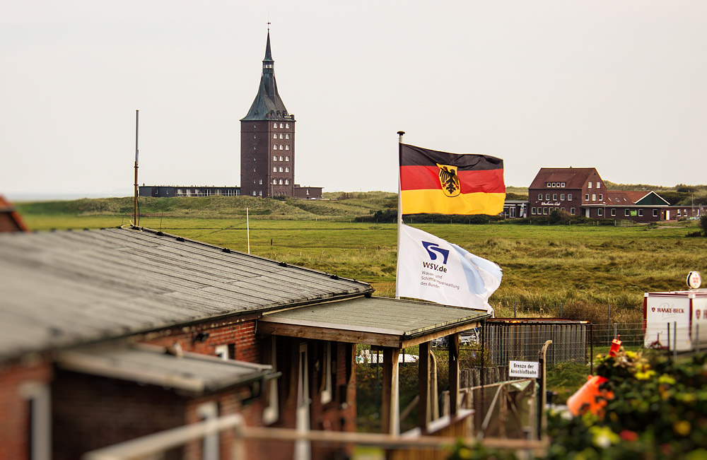 Die deutsche Bundesdienstflagge weht über dem Schirrhof des »Wasser- und Schiffahrtsamtes«, nur Bundesbehörden dürfen diese Flagge verwenden. Im Hintergrund der Westgroden und der Westturm.