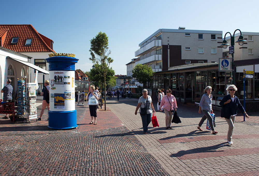 Vor der »Inselbuchhandlung« (links) steht eine Litfaßsäule, auf der allerlei Veranstaltungenshinweise zu finden sind. Rechts der Wintergarten vom »Hotel Hanken«, dahinter das »Haus Seeluft«.
