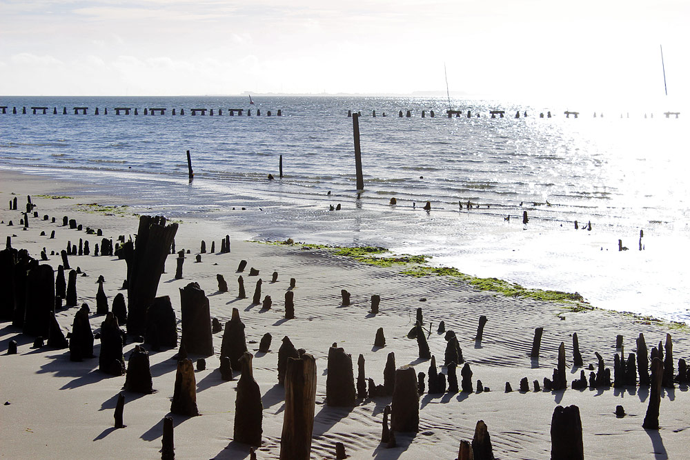 Ostanleger bei auflaufendem Wasser. Die Pfahljochstrecke im Hintergrund ist bereits überflutet, gleich wird das Wasser auch die Pfahlreihe im Vordergrund erreichen.