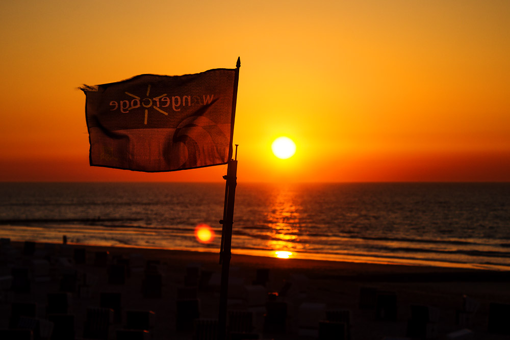 Ein toller Sonnenuntergang am Meer. Im Vordergrund eine kleine Flagge mit Wangerooge-Logo, die an der dortigen Badekarre weht.