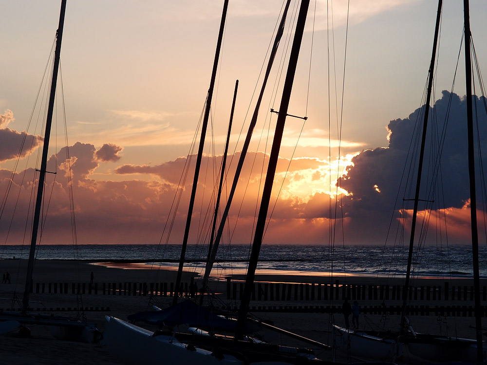 Tolle Abendstimmung am Surfstrand. Im Vordergrund warten die Katamarane auf ihren nächsten Einsatz.
