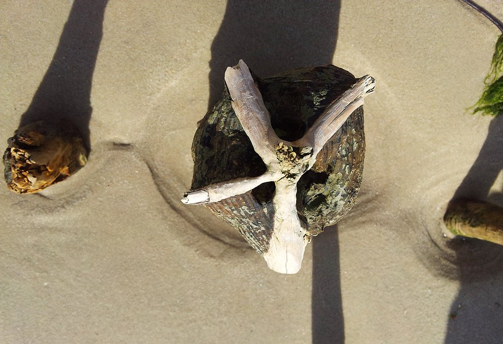 Ein paar Pfähle in der Vogelperspektive. Bei einem dieser Pfähle ist im oberen Bereich nur noch das härtere Holz übrig geblieben, der weichere Rest hat sich mittlerweile in seine Bestandteile aufgelöst.