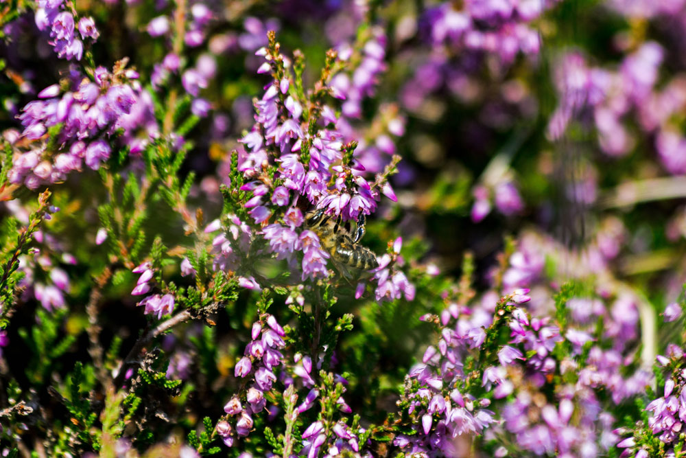 Finden Sie sie? Eine Nektar sammelnde Biene ist gerade auf dem Heidekraut gelandet.