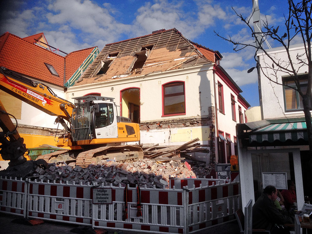 Hier noch einmal die ehemalige »Fleischerei Drees« aus einer anderen Perspektive betrachtet. So ein Abbruch kann zwar laut, aber auch überaus interessant sein. Die Gäste auf der Terrasse der »Düne 17« haben dabei einen Logenplatz.