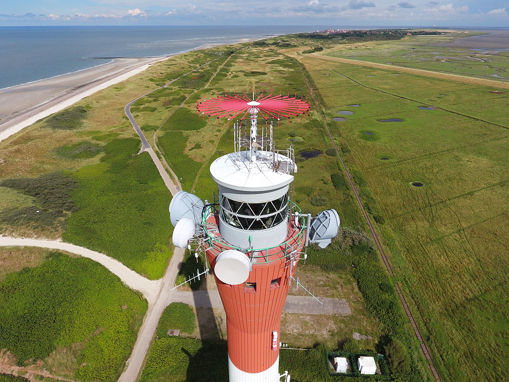 Blick von schräg oben auf den Neuen Leuchtturm im Westen. In der Ferne ist das Inseldorf zu erkennen, welches sich in der Inselmitte befindet, vorn der Westinnengroden mit Bombentrichtern..
