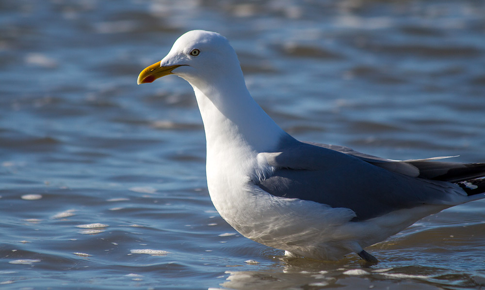 Ein Prachtexemplar einer Silbermöwe watet durch das flache Wasser.