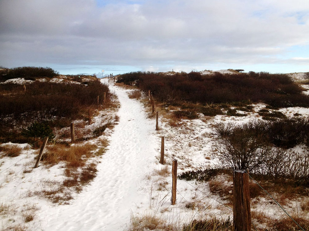 Der Bildautor überquert die Dünen auf einem idyllisch verschneiten Dünenweg.