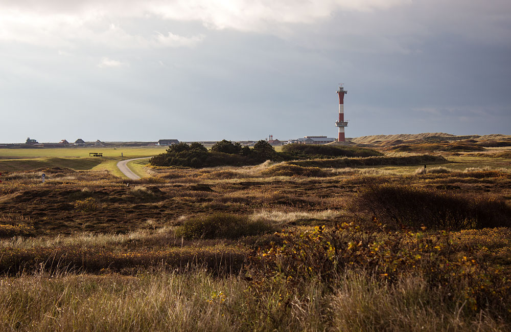 Wir schauen auf eine Braundünen-Landschaft, die großflächig mit Heidekraut bewachsen ist. Links ist gut der Westgrodendeich zu erkennen, dahinter das Westdorf.