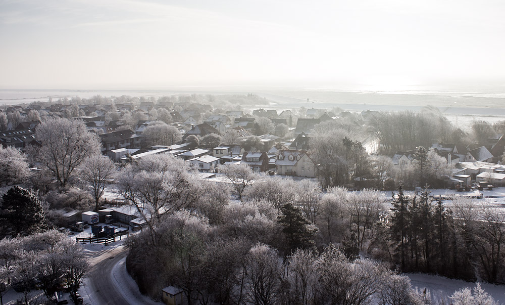161 Stufen haben wir bis zur Außenplattform des Alten Leuchtturms erklommen, belohnt werden wir mit einer tollen Aussicht über das winterliche Dorf.
