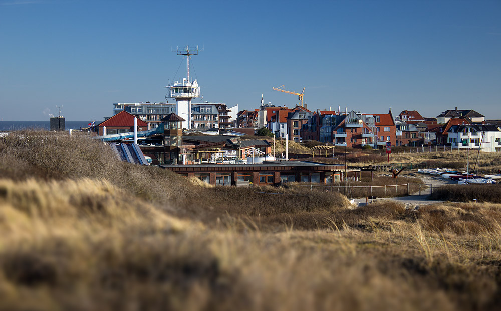 Von der Aussichtsplattform bei der Überwegung »Bielefelder Heim« aus blicken wir in Richtung Ort. Man erkennt u. a. das Meerwasser-Freizeitbad, die Signalstation, das Servicegebäude mit »Oberdeck« und einen Baukran, der in der »Zedeliusstraße« steht.