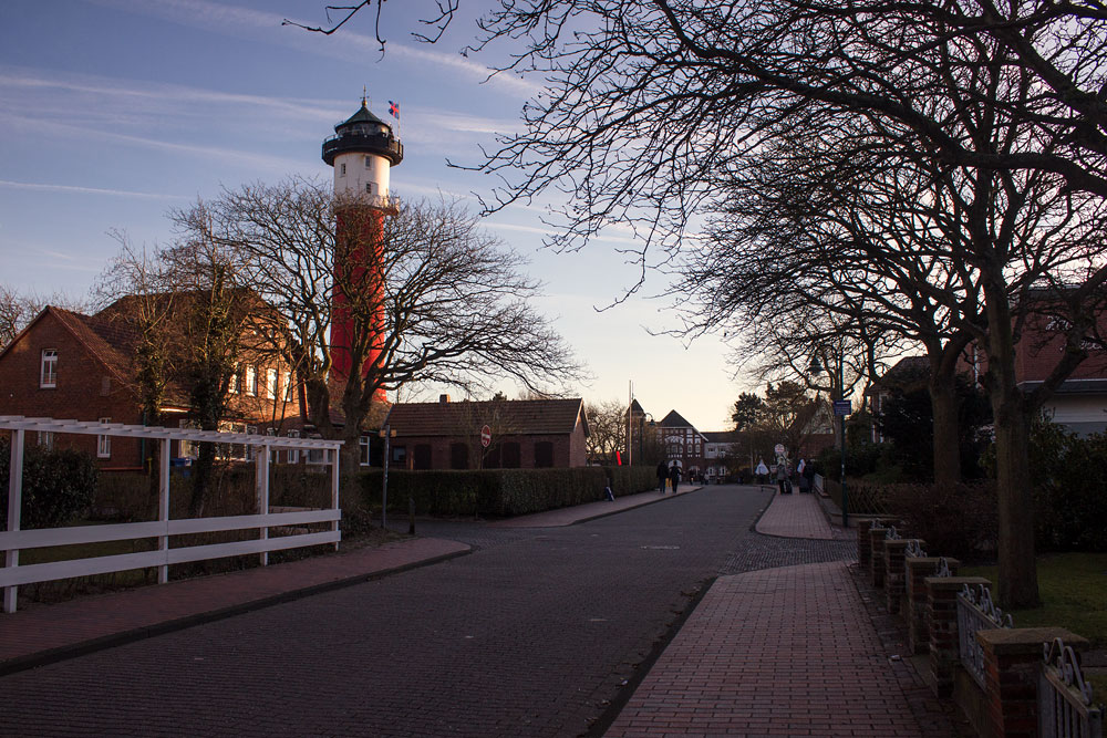 Eine typische Dorfansicht mit dem Alten Leuchtturm und im Hintergrund dem Inselbahnhof. Eine Meter vom Fotostandort entfernt kreuzt sich die »Zedeliusstraße« mit der »Schulstraße«.