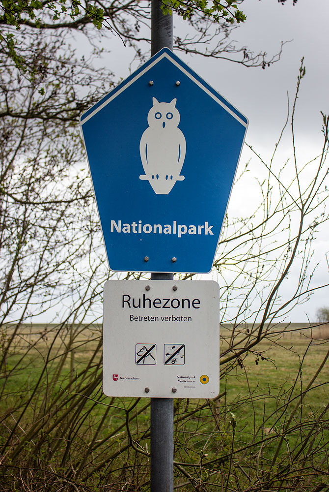 ‹ Seit etwa 2013 macht auch im »Nationalpark Niedersächsisches Wattenmeer« die aus der ehemaligen DDR bekannte »Kretschmann-Eule« auf das Naturschutzgebiet aufmerksam. Unter dem Schild fünfeckigen, blauen Schild befindet sich außerdem ein Zusatzschild mit Informationen zur Zonierung.