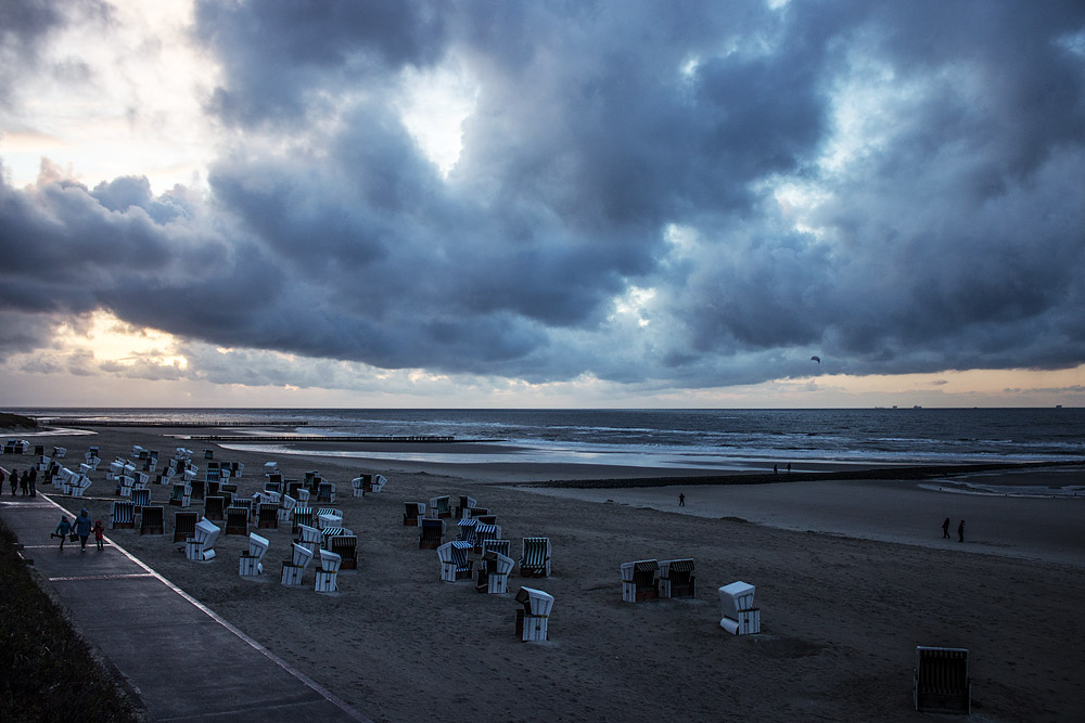 Dicke Wolken ziehen über den Hauptstrand hinweg, auch der eine oder andere kurze Schauer ist dabei.