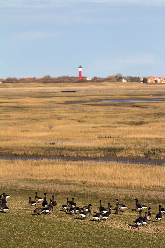 ‹ Während im Westinnengroden zahlreiche Weißwangengänse rasten, sind hier am Deichfuß einige Ringelgänse zu erkennen. Sie sind am weißen Fleck links und rechts am Hals bei einem ansonsten schwarzen Kopf gut zu identifizieren.
