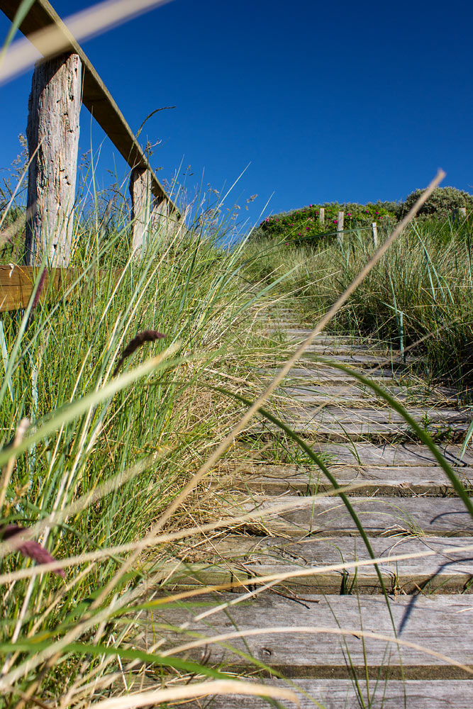 ‹ Die Dünenüberwegung am Ehrenfriedhof wird langsam von Dünengras überwuchert, aufgrund einiger defekter Treppenstufen ist sie derzeit gesperrt.