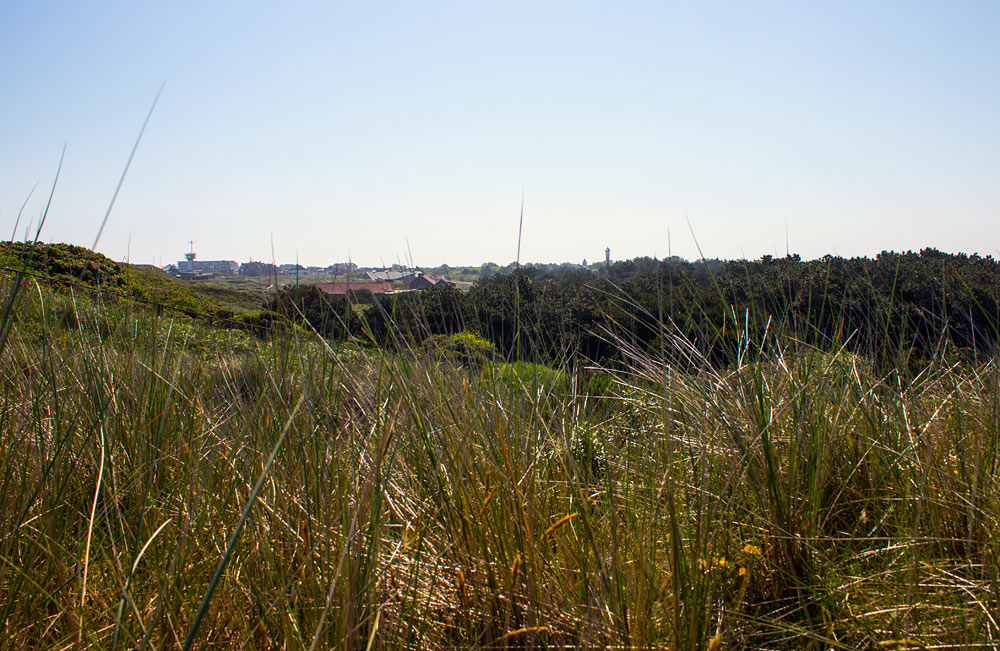 Hier ein Blick von den Norddünen in Richtung Inseldorf. Im Kiefernwäldchen befindet sich der Ehrenfriedhof für die Gefallenen aus den Weltkriegen.